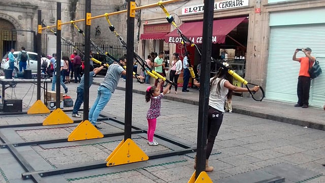 Morelia, Michoacán (MiMorelia.com).- Por segundo año consecutivo, se montará en espacios públicos de Morelia la instalación artística y deportiva "Warning Tapes", que consiste que promover la actividad deportiva a través de un aparato de suspensión que cuentan con sensores de movimiento y música.