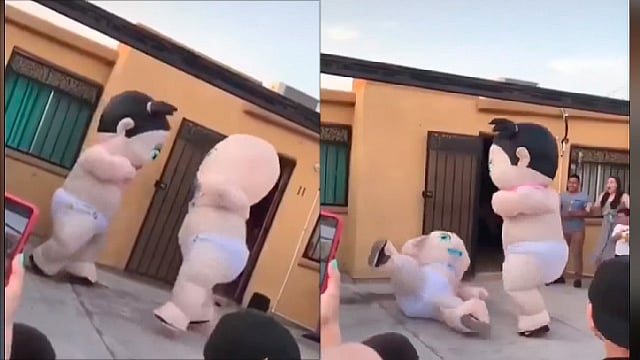 Este fin de semana se viralizó otra forma muy particular de que los futuros padres y familiares conozcan el sexo del bebé; en esta ocasión es con dos grandes botargas de bebés que luchan.