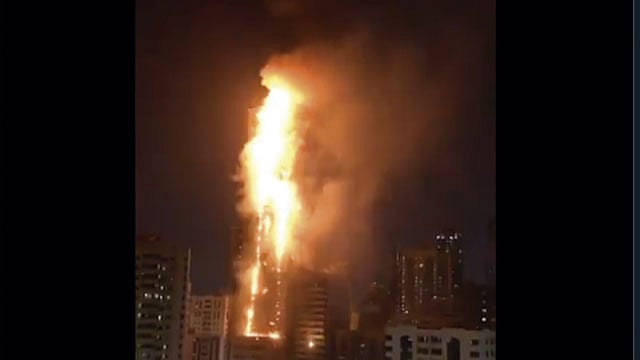 Varias imágenes que circulan en redes sociales muestran el edificio rodeado en llamas y pequeños fragmentos cayendo al vacío.