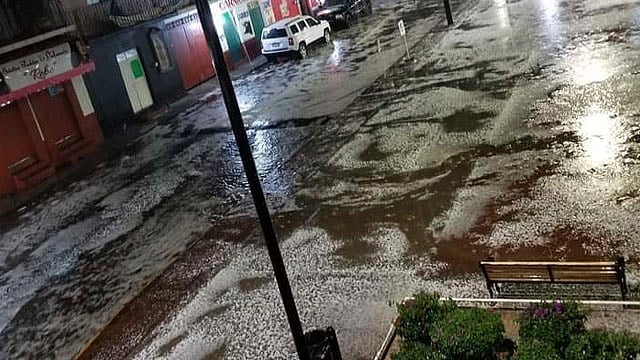 Morelia, Michoacán (MiMorelia.com).- La noche de este jueves se registró una fuerte lluvia acompañada de granizo que pintó de blanco las calles de la tenencia de Capula.