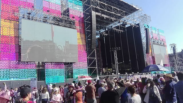 Mientras técnicos de sonido afinan detalles en el estrado, la gente observó por las pantallas el traslado de López Obrador rumbo al Palacio Legislativo, donde habrá de tomar protesta y emitir un primer mensaje a la nación.