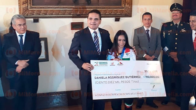 En una breve ceremonia celebrada en el salón principal del Palacio de Gobierno, en el marco del tradicional desfile cívico-deportivo de la capital, el gobernador de Michoacán, Silvano Aureoles Conejo, hizo entrega del máximo reconocimiento deportivo y un estímulo de 110 mil pesos a la joven de 20 años, quien recientemente ganó la presea de bronce en los Juegos Centroamericanos.
