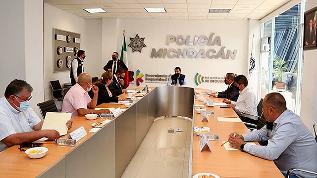 Morelia, Michoacán (MiMorelia.com).- El secretario de Seguridad Pública, Israel Patrón Reyes, se reunió con el presidente de la Comisión de Seguridad Pública y Protección Civil del Congreso del Estado Humberto González Villagómez y el diputado Arturo Hernández Vázquez, así como, con los presidentes municipales de Huaniqueo, Huandacareo, Jimenéz, Penjamillo, Morelos y José Sixto Verduzco, para revisar los mecanismos de operación que permitan reforzar las labores de disuasión del delito.