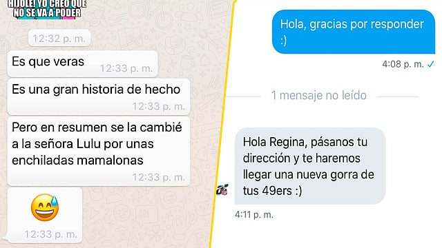 Fue a través de Twitter que Regina compartió unas capturas de pantalla, es las que demostraba un chat con su "ex"; la historia resumida: el joven, al ya no ser novios, decidió canjear la gorra por unas enchiladas de Doña Lulú.