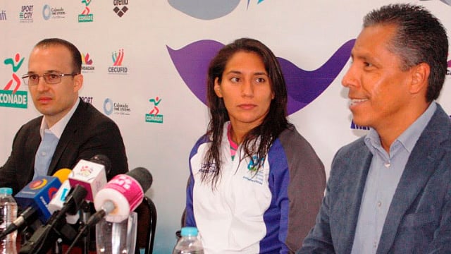 La nadadora originaria de Celaya, Guanajuato, ofreció una conferencia de prensa en compañía de Kiril Todorov, Presidente de la FMN, y el Director General del Instituto Municipal de Cultura Física y Deporte (IMDE), Gustavo Juárez Bedolla.