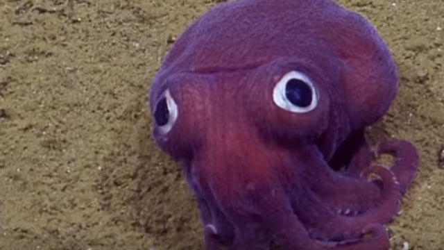 El molusco de 'ojos saltones' y de un color púrpura, muy llamativo, parece de juguete, "como si a un niño se le hubiera caído su peluche a la profundidad del océano", afirma una de las investigadoras en el video.