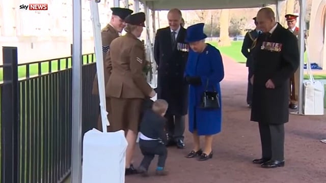 Por ello la madre tuvo que tratar de calmarlo, todo esto ya en presencia de la reina quien sonrió en todo momento y finalmente recibió las flores de la mano de la madre.