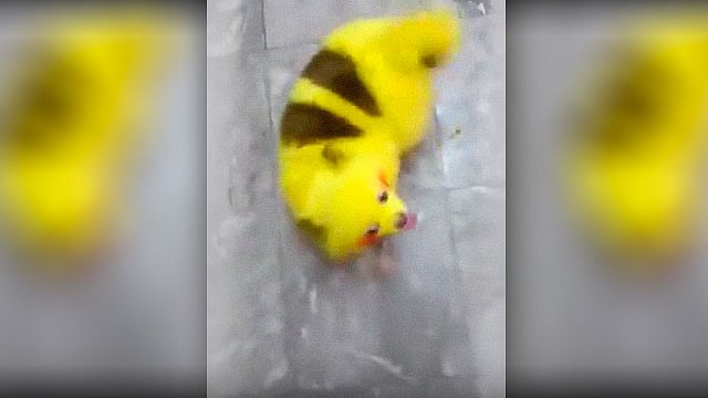El video muestra al pequeño can pintado de color amarillo, con rayas cafés en el lomo y dos círculos rojos en el hocico, asemejando a uno de los personajes de la caricatura y del popular juego Pokémon GO.