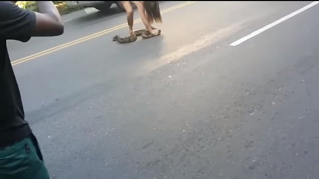 Morelia, Michoacán (MiMorelia.com).- Una anaconda decidió pararse en medio de una carretera en Brasil deteniendo el tráfico. La incertidumbre se hizo presente entre la gente que observa con precaución a la serpiente, sin saber exactamente cómo proceder. De pronto, una mujer con mucha decisión y sin miedo, agarró a la anaconda por la cabeza y se la llevó del lugar, despejando la vía. Después de realizar esta hazaña, la mujer aprovecho para tomarse varias fotos con la serpiente.