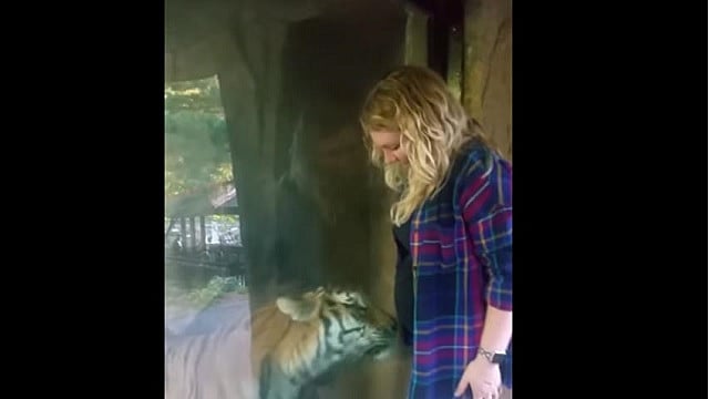 Potawatomi, Indiana (MiMorelia.com).- En el zoológico de Potawatomi, Indiana, una mujer embarazada vivió un enternecedor momento que quedó grabado en video. Un tigre se acerca al cristal de su jaula para llamar la atención de la mujer embarazada.