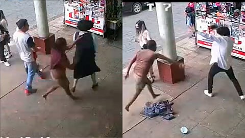 Es enseguida que la mujer se dirige a ellos, y sin más se va contra la joven, sin embargo el hombre que la acompaña evita que la golpeen y es él quien comienza la golpea con la desconocida. Por ser grabación de cámara de seguridad no se oye lo que la mujer dice.