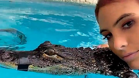 Morelia, Michoacán (MiMorelia.com).- A un lagarto le amarraron el hocico con cinta adhesiva para que Lele Pons nadara con él; luego de compartir las fotos, usuarios acusaron a la youtuber de maltrato animal.