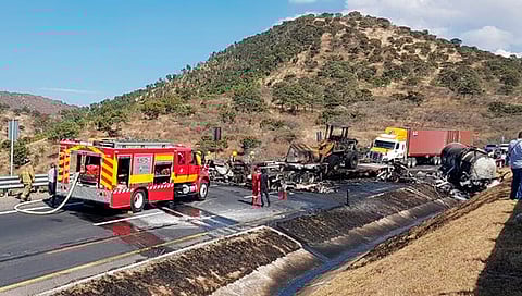 Morelia, Michoacán (MiMorelia.com).- La Coordinación Estatal de Protección Civil, por conducto de su delegación regional Morelia, apoya las labores de emergencia en un incendio de varios vehículos tras un choque de una pipa con combustible y un tráiler en la autopista de Occidente en el municipio de Zinapécuaro.