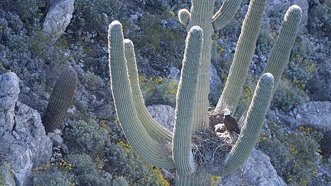Arizona (MiMorelia.com).- Un equipo del Departamento de Caza y Pesca de Arizona (AZGFD) logró encontrar y captar nidos de águilas calvas en los cactus de saguaro del desierto de Sonora, Arizona (EU), se tenía información desde 1930 de que estas aves solían anidar en esa especie de cactus, sin embargo, hasta este momento no había registro fotográfico que lo confirmara.