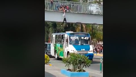En el breve clip, podemos ver el momento exacto en que un grupo de personas en un puente peatonal sostiene a una muchacha de la mano, quien al parecer acababa de lanzarse.