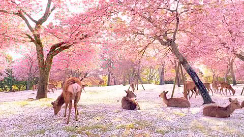 En esta ocasión, un momento hermoso y único fue ver a varios ciervos en Japón descansando tranquilamente bajo los cerezos recién floreados en un parque.