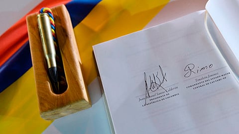Al igual que en el primer acuerdo, se utilizó un bolígrafo fabricado con un casquillo de bala de fusil, que simboliza el tránsito de Colombia de la guerra a la paz.