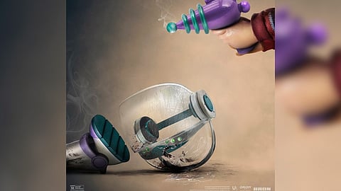 En el póster publicado en las redes sociales de la cinta, se puede ver parte el traje espacial destrozado, y la mano de Chucky con la prueba del delito, sosteniendo la propia arma del juguete espacial.