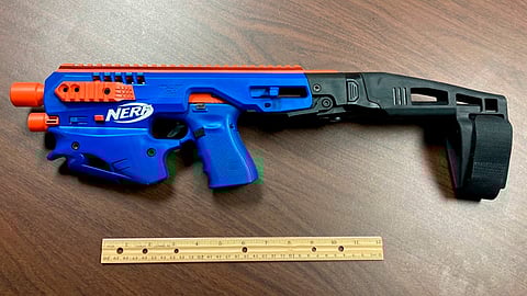 El arma confiscada fue modificada para asemejarse a un juguete que dispara dardos de goma, cuando en realidad era una Glock 19, con tambor con capacidad para 50 cartuchos, la cual fue cuidadosamente pintada e intervenida.