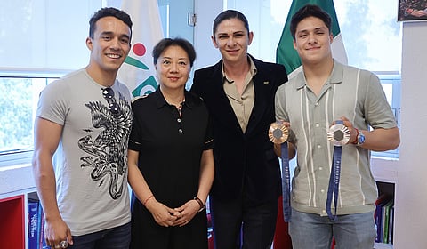 Morelia, Michoacán (MiMorelia.com).- Los clavadistas mexicanos Osmar Olvera y Juan Celaya, junto con su entrenadora Ma Jin, visitaron a Ana Gabriela Guevara Espinoza, directora general de la Comisión Nacional de Cultura Física y Deporte (Conade).