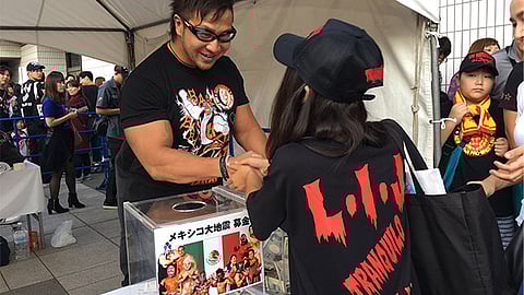 Japón (MiMorelia.com/Redacción).- El luchador profesional japonés, Satoshi Kojima, antes de su presentación en el New Japan Pro Westling se acercó a sus fans afuera de la arena y los invitó a cooperar con dinero para ayudar a las víctimas de los terremotos en México.