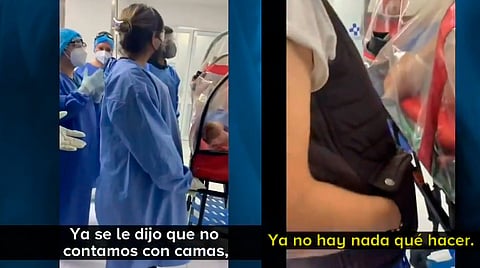 Mientras el hombre está aún con vida en una cápsula para pacientes con Covid-19, los hijos insisten en que atiendan a su padre, pero esto no pasa.