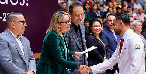 Frente a las recién egresadas y egresados de la Facultad de Odontología, compartió que a través del título electrónico que se puede obtener en una semana, las y los jóvenes podrán hacer sus trámites a tiempo para continuar con sus estudios o encontrar un empleo.