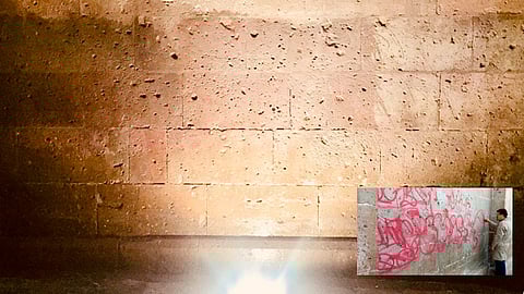 Morelia, Michoacán (MiMorelia.com).- Después de más de 20 horas de trabajo, el grafiti de más de dos metros de extensión que realizaron personas hasta el momento anónimas a un costado de la Catedral de Morelia quedó eliminado.