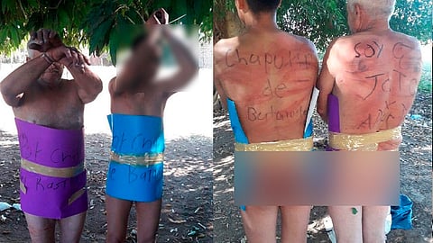 En las cartulinas se observa que se les acusa de "chapulines", mientras que sus cuerpos presentan claros signos de golpes en los glúteos y espalda.