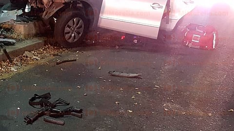 Morelia, Michoacán (MiMorelia.com).- Un auto Volkswagen Gol de color gris se impactó contra un semáforo en el Libramiento Independencia de esta capital, a la altura del fraccionamiento 450; al conductor se le encontraron armas de fuego en su poder, según los datos obtenidos en la labor periodística.