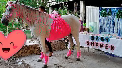 Morelia, Michoacán (MiMorelia.com).- Las imágenes de celebración del baby shower de una yegua embarazada con globos, flores y pastel en Yucatán se hicieron virales en las redes sociales.