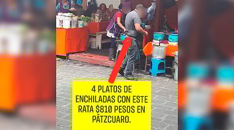 Morelia, Michoacán (MiMorelia.com).- A través de los grupos de denuncia en Facebook un usuario afirmó que en uno de los puestos de comida ubicados en las cercanías de la Plaza Vasco de Quiroga en Pátzcuaro, pagó una excesiva cuenta de 810 pesos cuando solo consumió cuatro platos de enchiladas.