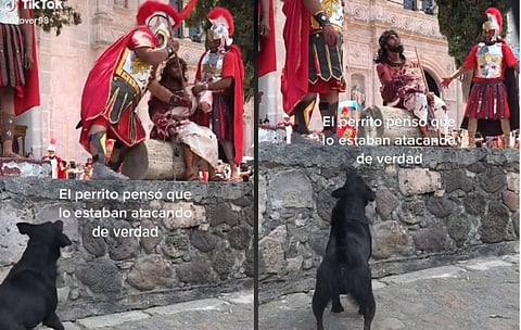 En el video se muestra al peludo ladrando desesperado contra los actores que golpeaban a quien representa a Jesús