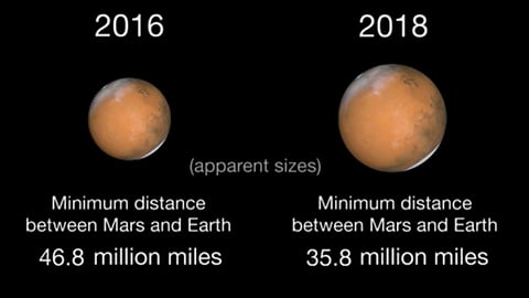 Ésa constituirá la menor distancia entre los planetas vecinos, aunque para el año 2018 disminuirá a 57.6 millones de kilómetros (35.8 millones de millas), y entonces la tonalidad escarlata podrá observarse mucho más grande y visible desde nuestro cielo que ahora, dentro de un par de semanas.
