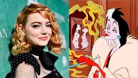 Emma Stone luce con la caracterización icónica que todos tenemos de la villana; pelo mitad blanco y mitad negro, vestido de cuero y labios color rojo.