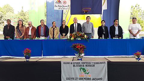 "El trabajo que se ha realizado en esta región es resultado del compromiso entre docentes, directivos, madres y padres de familia, ayuntamientos, gobierno del estado, todos en coordinación caminando por una sola institución, el CECyTEM", expresó la funcionaria estatal durante el acto conmemorativo por el noveno aniversario del plantel San Pedro Jacuaro, en el municipio de Hidalgo.