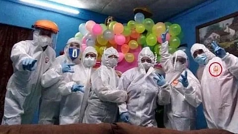 Los trabajadores organizaron una fiesta de cumpleaños; cuyas fotografías fueron compartidas en redes sociales. En ellas se ve al personal con trajes especializados con logotipos de la sociedad médica que lo había donado.