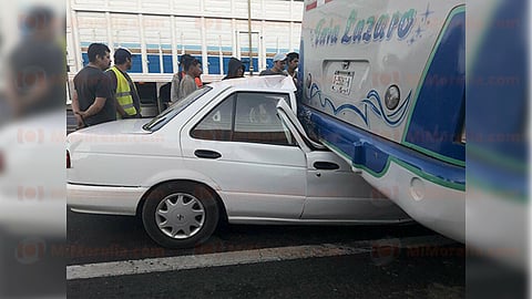 Uruapan, Michoacán (MiMorelia.com/RED 113).- El chofer de un vehículo Tsuru resultó lesionado al quedar prensado en su unidad, luego de colisionar por alcance contra un camión de la línea Tata Lázaro, según se supo en la labor periodística.