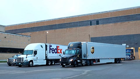 Camiones de operadores logísticos de Fedex y Ups salieron a primera hora de esta madrugada de la planta farmacéutica de Pfizer. Estas empresas contribuyen a la distribución a temperaturas ultrafrías, como lo requieren las dosis.