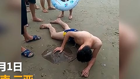 China (MiMorelia.com/Redacción).- Un joven acudió a la playa en la ciudad de Sanya en China, en lo que se supone sería un día de esparcimiento, pero fue todo lo contrario, ya que salió con una mantarraya aferrado a sus genitales.