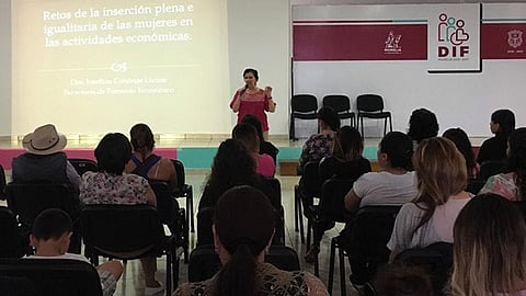 Dentro de las acciones de dicha jornada, la secretaria de Fomento Económico, Josefina María Cendejas Guízar impartió la conferencia "Retos de la Inserción Plena e Igualitaria de las Mujeres en la Actividad Económica" a un grupo de interesadas en impulsar proyectos productivos que les permitan generar recursos económicos para el apoyo de su hogar y familias.
