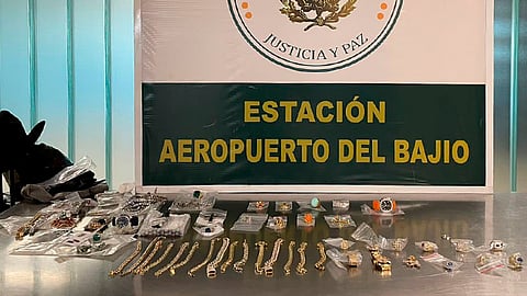 Guanajuato, (Mimorelia.com).- Un aproximado de 80 piezas de joyería con valor cercano a 43 millones de pesos, fueron decomisadas en el Aeropuerto Internacional del Bajío, en el estado de Guanajuato, por elementos de la Guardia Nacional (GN) y personal de la Agencia Nacional de Aduanas de México (ANAM).