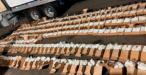 Durante la inspección, con el apoyo de un binomio canino, se localizaron 575 cajas de cartón ocultas bajo el piso del remolque, las cuales contenían la droga sintética, informaron las fuerzas armadas mediante un comunicado.