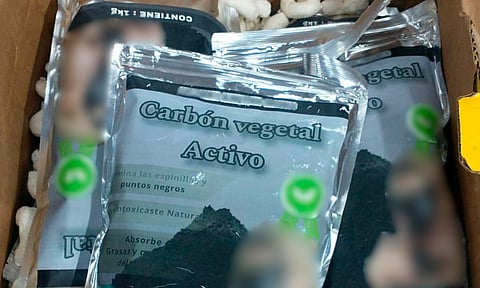 Al inspeccionar la caja localizaron 15 bolsas plásticas etiquetadas como carbón vegetal activo para mascarillas faciales que en su interior las cuales contenían una sustancia granulada con las características de la droga sintética cristal.