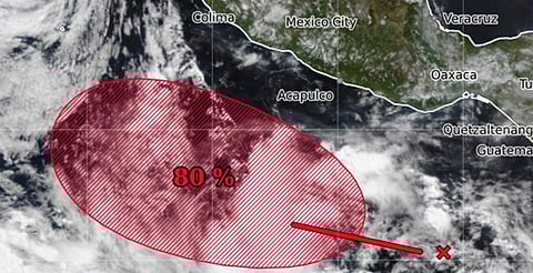 El sistema se localiza a 590 km al sur de Puerto Ángel y podría evolucionar a ciclón tropical durante el fin de semana, con desplazamiento hacia el oeste-noroeste, rumbo a las costas de Guerrero y Michoacán.