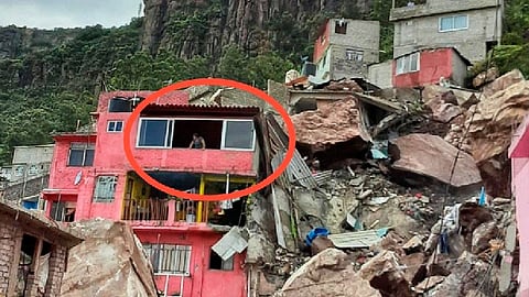 En la imagen se puede apreciar varias casas sepultadas bajo los escombros, sin embargo, en medio de éstas sigue en pie una modesta casa de color rosa y desde la ventana del segundo piso se ve a una mujer que desesperada pide ayuda, ya que la entrada a la vivienda se encuentra bloqueada por rocas y tierra.