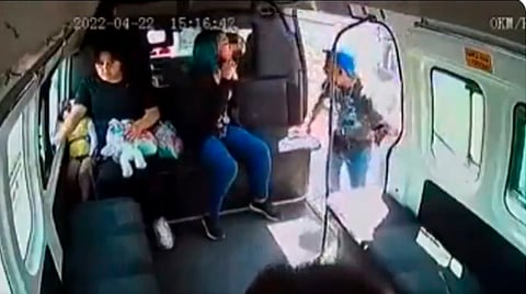 Se aprecia en el que video que unas mujeres viajan en el transporte público y la unidad se para para subir a dos hombres que supuestamente la abordarían.