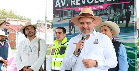 Uruapan, Michoacán (MiMorelia.com).- Con una inversión estatal de 62 millones de pesos, el gobernador Alfredo Ramírez Bedolla arrancó de manera formal, la segunda etapa de la modernización con concreto hidráulico de la avenida Revolución de Uruapan para contribuir al desarrollo y modernización de la ciudad, “porque el teleférico no llega solo”.