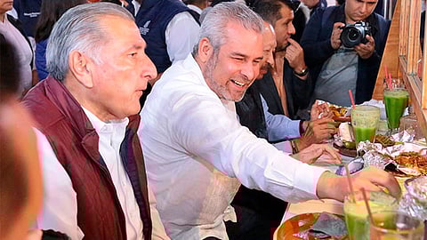 Morelia, Michoacán (MiMorelia.com).- Cerca de las 10:00 horas llegó el gobernador Alfredo Ramírez Bedolla y el secretario de Gobernación, Adán Augusto López, a "echar" taco y jugo verde para empezar el día.