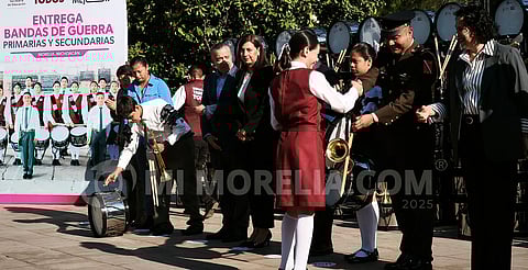 En el evento, que se llevó a cabo en la Plaza Morelos de Morelia, la titular de la Secretaría de Educación del Estado (SEE), Gabriela Molina Aguilar, indicó que los instrumentos para las bandas de guerra se distribuyeron en 15 escuelas primarias, 14 secundarias, 9 secundarias técnicas y 4 telesecundarias de los diferentes municipios.